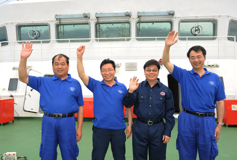 1,蛟龍?zhí)柡T嚳傊笓]劉峰(左二)、“海洋六號”船首席科學(xué)家楊勝雄(右二)、海試臨時黨委書記劉心成(左一)等科學(xué)家在船甲板上合影。