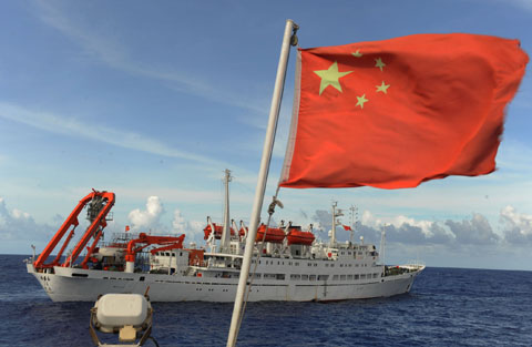 6,蛟龍?zhí)柲复跋蜿柤t9號”船和“海洋六號”護衛(wèi)船并肩停泊在太平洋上。