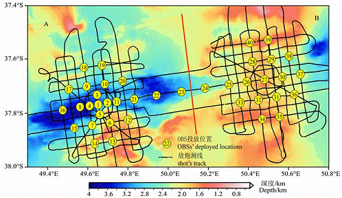 圖1:西南印度洋中脊3D地震探測(cè)OBS分布和測(cè)線