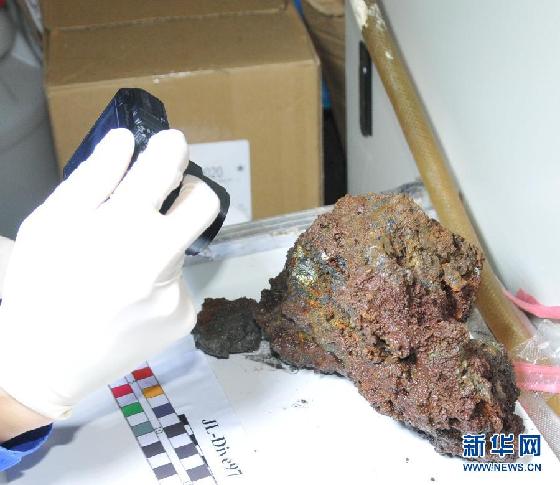 這是“蛟龍”號載人潛水器采集到的硫化物(1月29日攝)。當(dāng)日,中國載人潛水器“蛟龍”號在西南印度洋執(zhí)行2014-2015年試驗(yàn)性應(yīng)用航次(中國大洋35航次)第三航段首次下潛。“蛟龍”號在龍旂熱液區(qū)采集硫化物和煙囪樣品。新華社記者張旭東攝