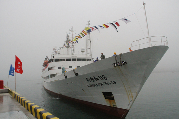 “向陽紅09”船搭載蛟龍號載人潛水器從毛里求斯的路易港航行回國