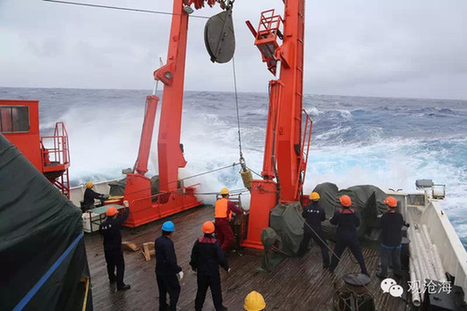 14日清晨,茫茫的海面上白浪翻滾,大風掀起巨浪洶涌而至,“大洋一號”船在劇烈地搖擺中微速前進。出乎意料的是,盡管一些隊員出現了暈船反應,但都準時出現在餐廳。