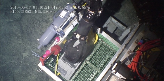 “海馬”機械手抓住一塊鈷結核準備放入樣品框中。(圖片截取自“海馬”拍攝的高清視頻)