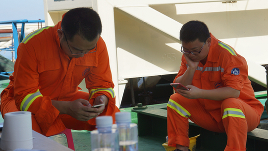 參加海洋六號36次大洋科考任務第三航段的人員埋頭上微信與家人聯系。