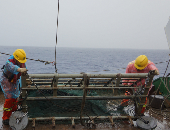 8月14日凌晨,中太平洋一場瓢潑大雨讓海洋六號調查人員的喜悅更顯珍貴。大洋36航次第三航段的最后一役——拖網取樣大獲全勝,800多公斤的多金屬結核從5000多米水底拖到后甲板。