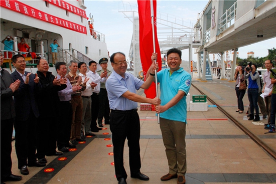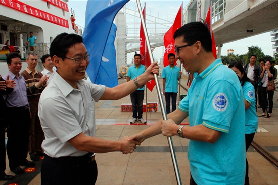 國家海洋局副局長、中國大洋協會理事長王飛為科考隊員授旗。
