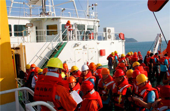 救生演練期間,科考隊員及船員在艇甲板等待指揮。