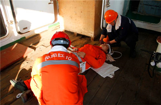 隊員回到船艙后不久,亂鈴加四短警報再次拉響,這一次的消防演練模擬機艙失火,有了一次演習經驗的科考隊員們拿著濕毛巾、戴好安全帽,魚貫而出走到后甲板上,積極待命。船員各司其職,排除“險情”。探火員迅速進入機艙“撲滅”不大的火勢。“報告輪機長,火勢不大已被撲滅,未造成更大損失”,穿著消防員裝備的探火員向現場指揮輪機長報告道。模擬救助傷員也同時展開,只見傷員被迅速固定在擔架之上,由四名船員將其抬出,接受救援。