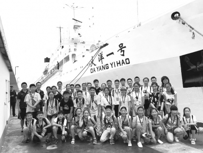 圖為小記者在“大洋一號(hào)”船前合影留念。 (王晶)