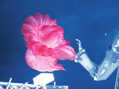 本次下潛共獲取硫化物樣品4塊,共計4.2公斤;玄武巖1塊,重18.7公斤;短柱狀沉積物插管3管,其中熱液沉積物1管;近底海水16升。下潛中觀察到枕狀玄武巖和灰白色有孔蟲砂,發現一片直徑約100多米的硫化物丘和死亡硫化物煙囪體,煙囪體高度達10米左右。高清攝像機拍攝到一只通體紅色、體長30厘米左右類似烏賊的深海生物。