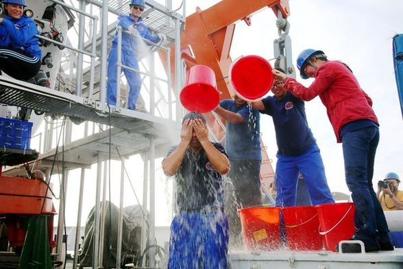 石學法爬出載人艙,走下鐵架。一桶桶海水從頭而降,他張開臂膀,迎接澆灌。“洗海澡”是載人深潛對首次下潛人員的獨特歡迎儀式。
