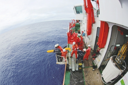當地時間9月2日13時30分,東太平洋海域大雨滂沱,經過近1個小時的努力,科考隊員成功將1臺水下滑翔機回收至“向陽紅03”船右舷甲板。至此,中國大洋45航次科考隊在該海域布放的3臺水下滑翔機全部回收,標志著我國首次利用水下滑翔機在東太平洋多金屬結核區開展的立體組網觀測試驗圓滿成功。
