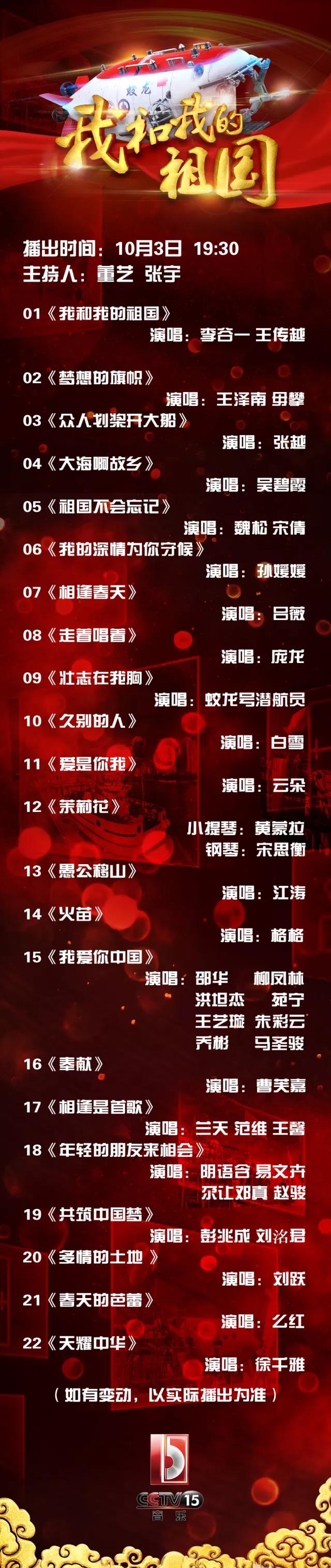 在這里,你們可以聽(tīng)到老中青三代藝術(shù)家,走到全國(guó)各個(gè)重要工程項(xiàng)目地唱響“我和祖國(guó)的歌”。60多位歌手以及來(lái)自中國(guó)大洋礦產(chǎn)資源研究開(kāi)發(fā)協(xié)會(huì)辦公室、國(guó)家海洋局北海分局、國(guó)家深?;毓芾碇行牡模玻埃岸嗝ぷ魅藛T和海監(jiān)隊(duì)員在“中國(guó)海警1501”船甲板激情演出。歌唱家李谷一、王傳越等人唱響最經(jīng)典的老歌《我和我的祖國(guó)》。