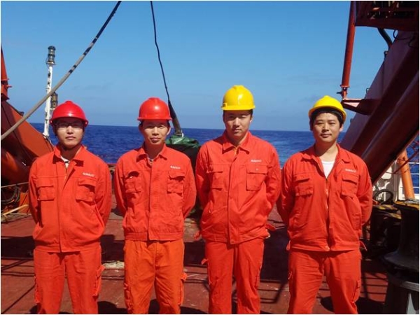 這四個小伙子,來自海洋二所船舶調查處海洋科學調查中心,屬于“向陽紅10”船舶保障組,自“向陽紅10”船建造那天起便蘊育而生,他們負責每個航次中的船載調查設備的保障維護工作,包括作業中萬米光電纜絞車、同軸纜絞車、地質纜絞車與CTD絞車,以及船載多波束、淺剖、ADCP等聲學設備的正常運行,是“向陽紅10”船上最為特殊的一群人。在整個大洋49航次第一航段,除了進行常規的設備運行與保養工作,他們還在最短的時間內解決了臨時突發的CTD絞車排纜故障、CTD采水器故障、尾部大A架油缸故障、深水多波束系統軟件故障、海事五代星互聯網通訊故障,有效地保障了航次作業的順利展開,“向陽紅10”船載調查設備的每一條管路、每一處電路,都留下了他們辛勤與智慧的汗水。不僅如此,還負責了第一航段氣象浮標與測波浮標的布放,這是大洋業務化航次的首個站位作業。