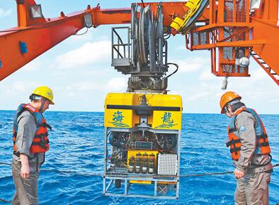 3月24日,中國“大洋一號”科考船上搭載的重點裝備“海龍Ⅲ”潛水器在西太平洋圓滿完成400米淺水試驗,這是“海龍Ⅲ”潛水器首次海試。“海龍Ⅲ”屬于中國“蛟龍探海”工程重點裝備,最大作業水深6000米,具備海底自主巡線能力和重型設備作業能力,可搭載多種調查設備和重型取樣工具。圖為“海龍Ⅲ”潛水器準備入水進行試驗。