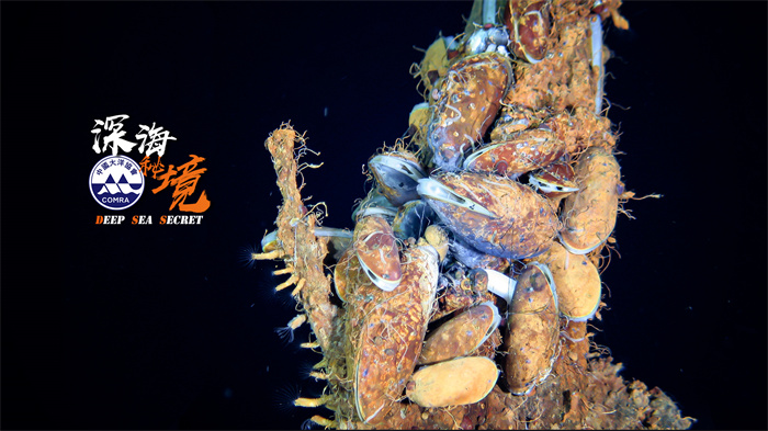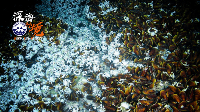 硫化物煙囪體上生活的貽貝、蠕蟲和茗荷
