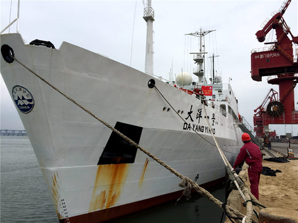 An April 15 photo shows Dayang Yihao, which carried the unmanned submersible Qianglong 3 and a research group of 70 people from Xiamen to the South China Sea. [Photo/Xinhua]